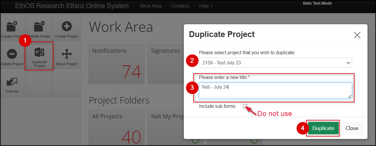 - Important: do not duplicate any subforms (renewals, closures, etc.) when you are duplicating an entire project