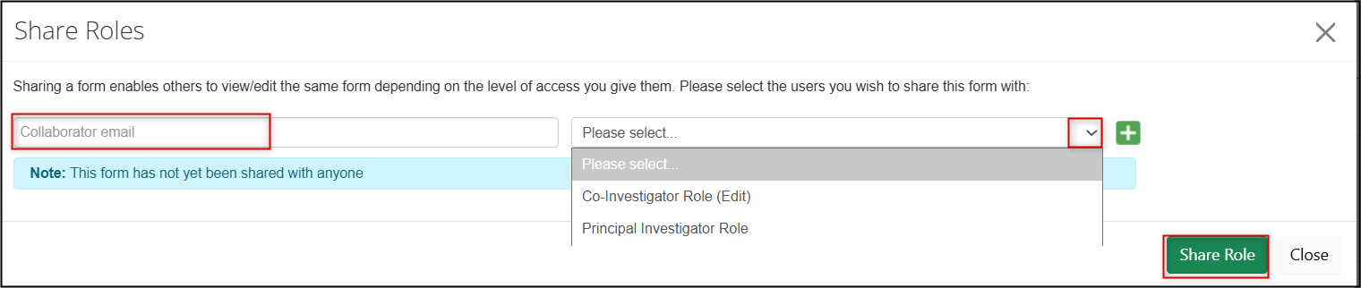 In the Share Roles pop-up window, search for the study team member/collaborator’s email address and choose the appropriate role from the drop-down menu