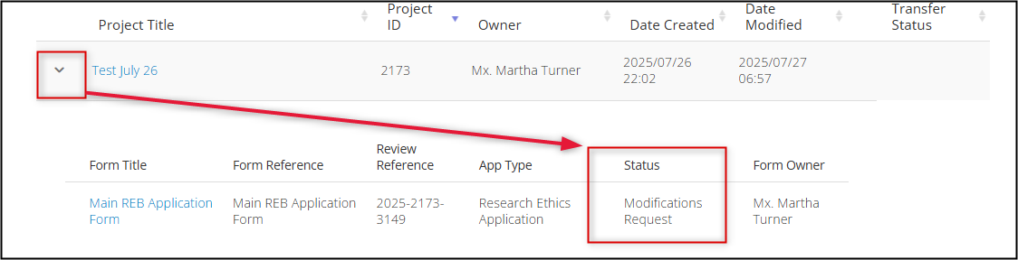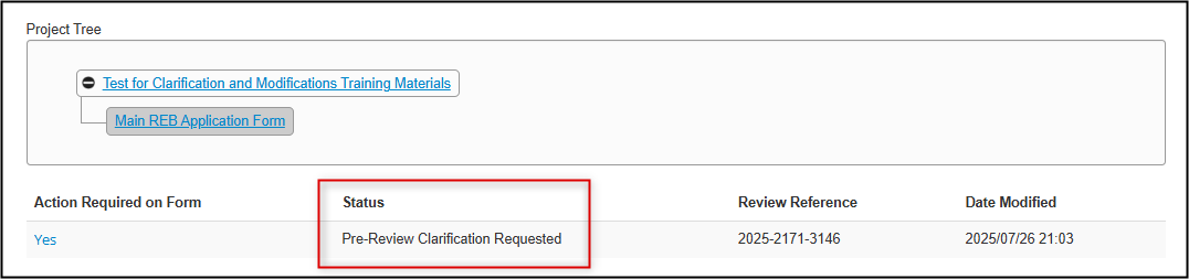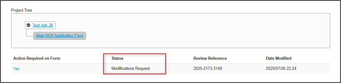 If your application is returned with a Modifications Requested status, your initial submission has been reviewed by the REB and you are being asked to address their feedback and/or required changes, prior to any further review/approval.