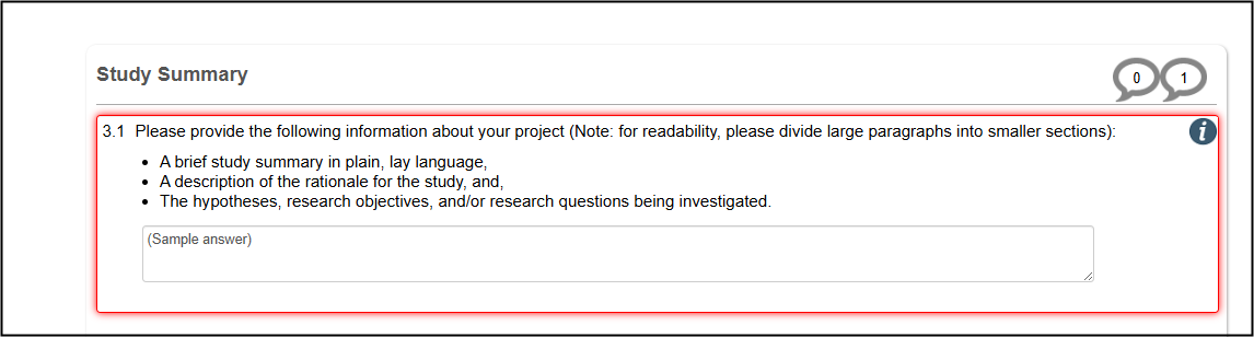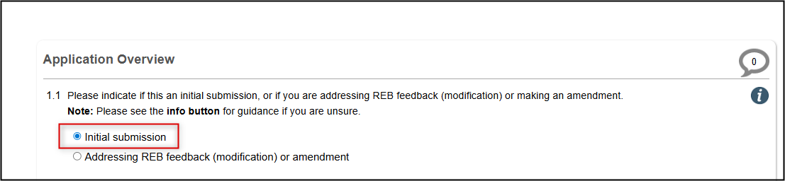 When your response to the Start Here, Application Overview Question 1.1 is set to Addressing REB feedback (modification) or amendment, the bottom of each page will include a [Page Title]: Notes to the REB (Optional) area.