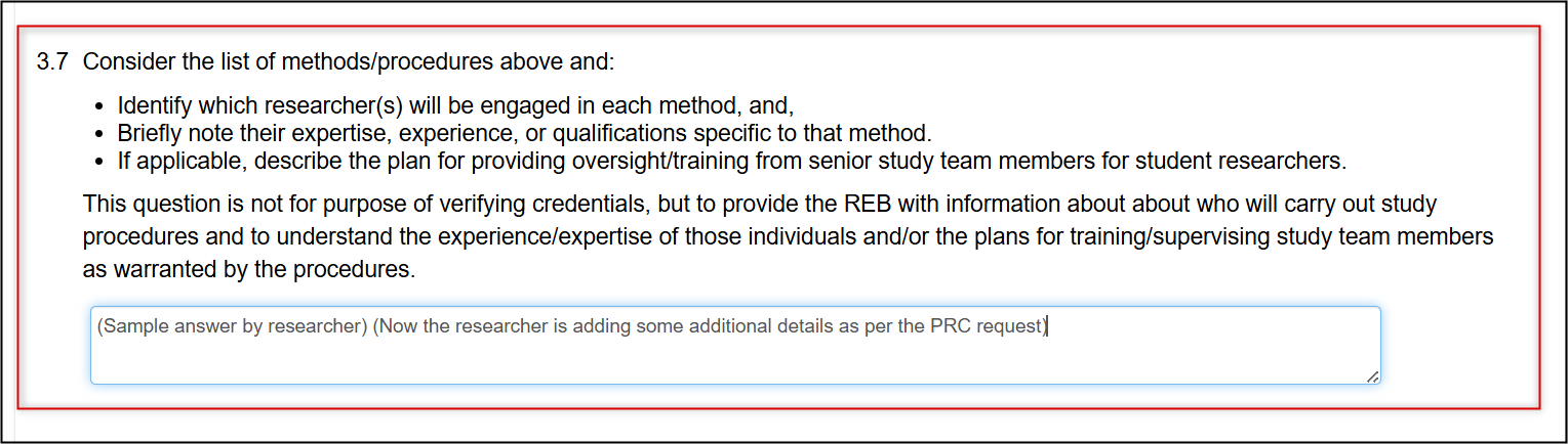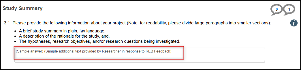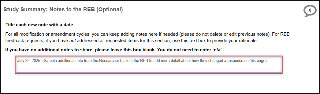 When modifications are requested, changes should be made directly in the form responses and/or attached documents as required. However, each [Page Title]: Notes to the REB (Optional) text box lets you add extra details about any of the changes or reply to the REB if they have only requested further explanation or clarification on any of the page items.