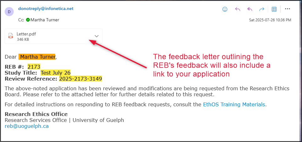 Open the email and download or preview the letter; it includes a summary of the comments/changes needed and a link to your application
