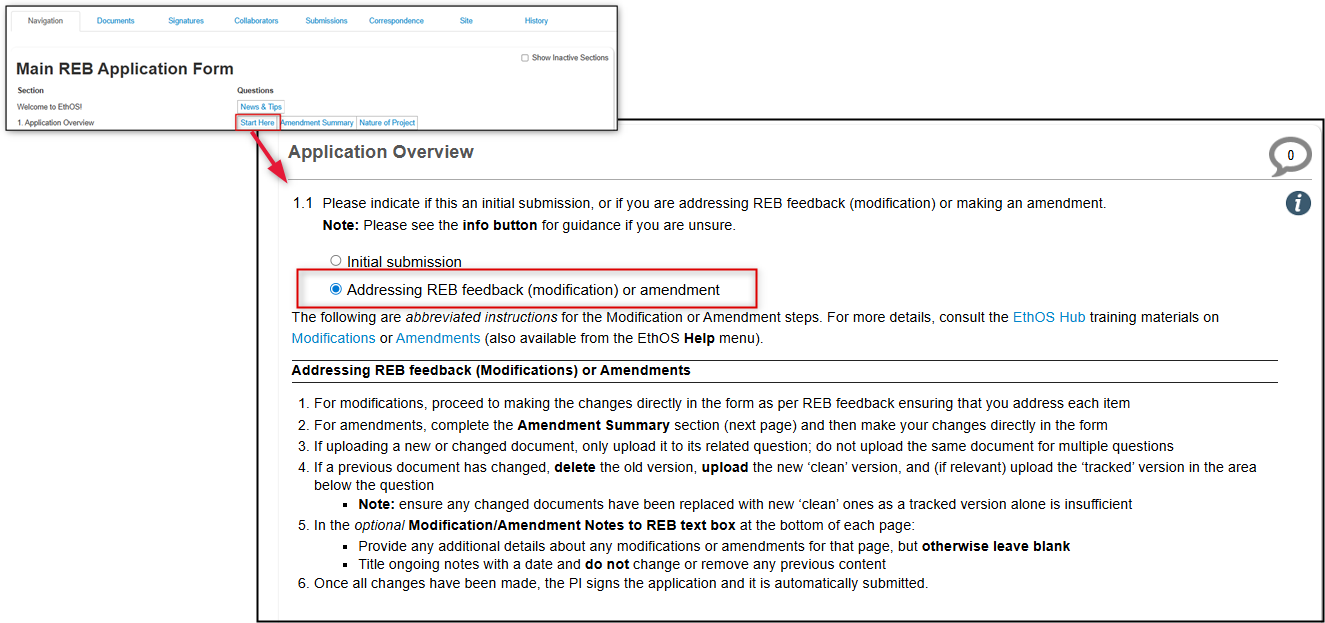 - Notice that abbreviated guidelines for modifications/amendments are displayed when you select the second option; you can find these again any time using the Navigate button and coming back to the Start Here section