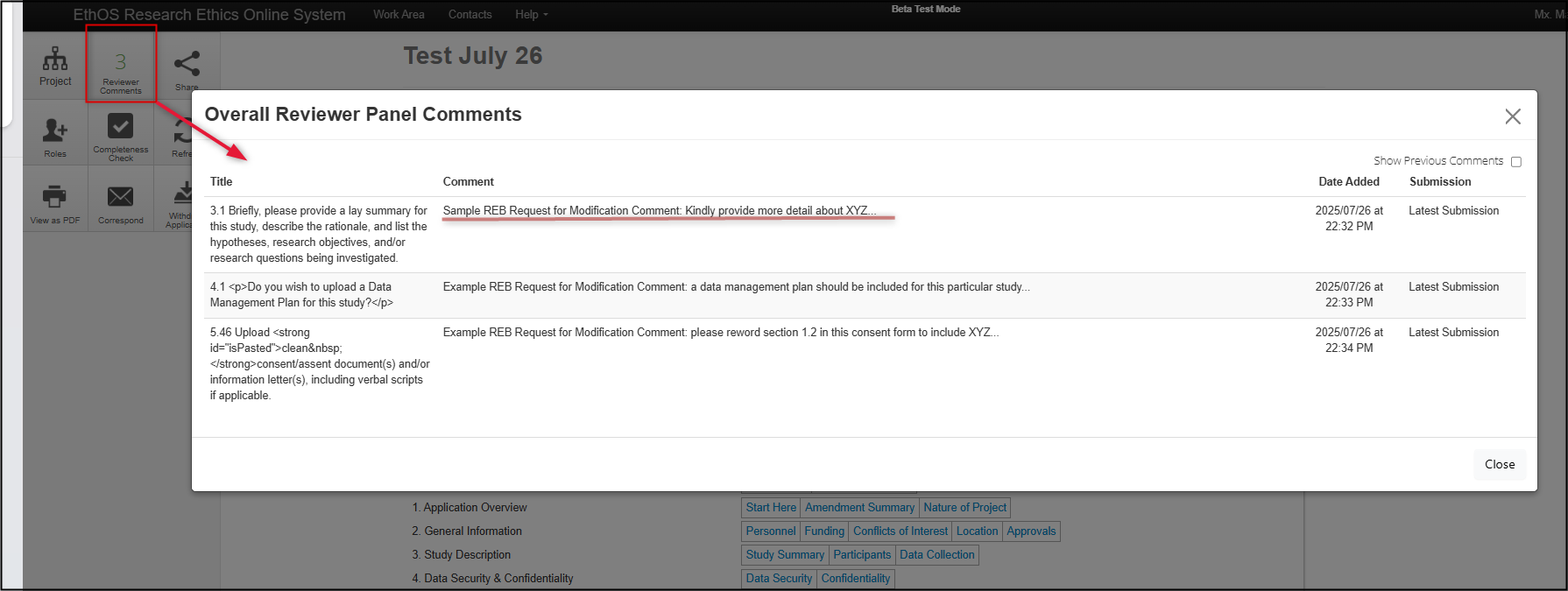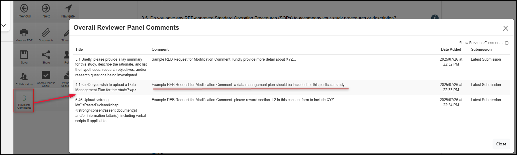 - Use the helpful Compare to Previous Submission feature (available to applicants, Ethics Office, and REB reviewers) any time to see/confirm what has changed
