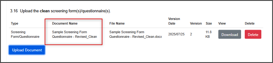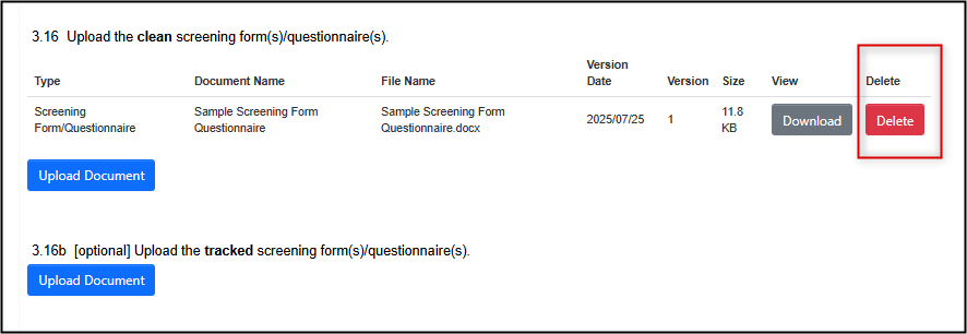 - Note: EthOS will only remove the document from the current submission version of the application form