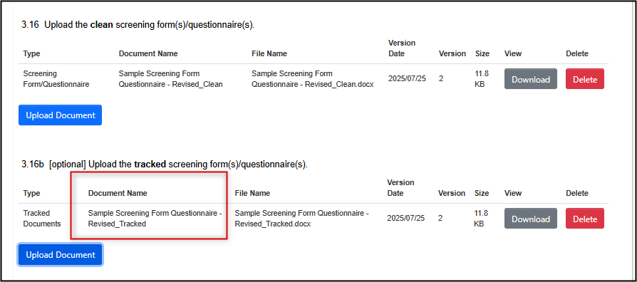 For Modification Requests, most (but not all) changed documents do require a tracked changes version to be uploaded; if prompted and applicable, upload it in the area below the clean document