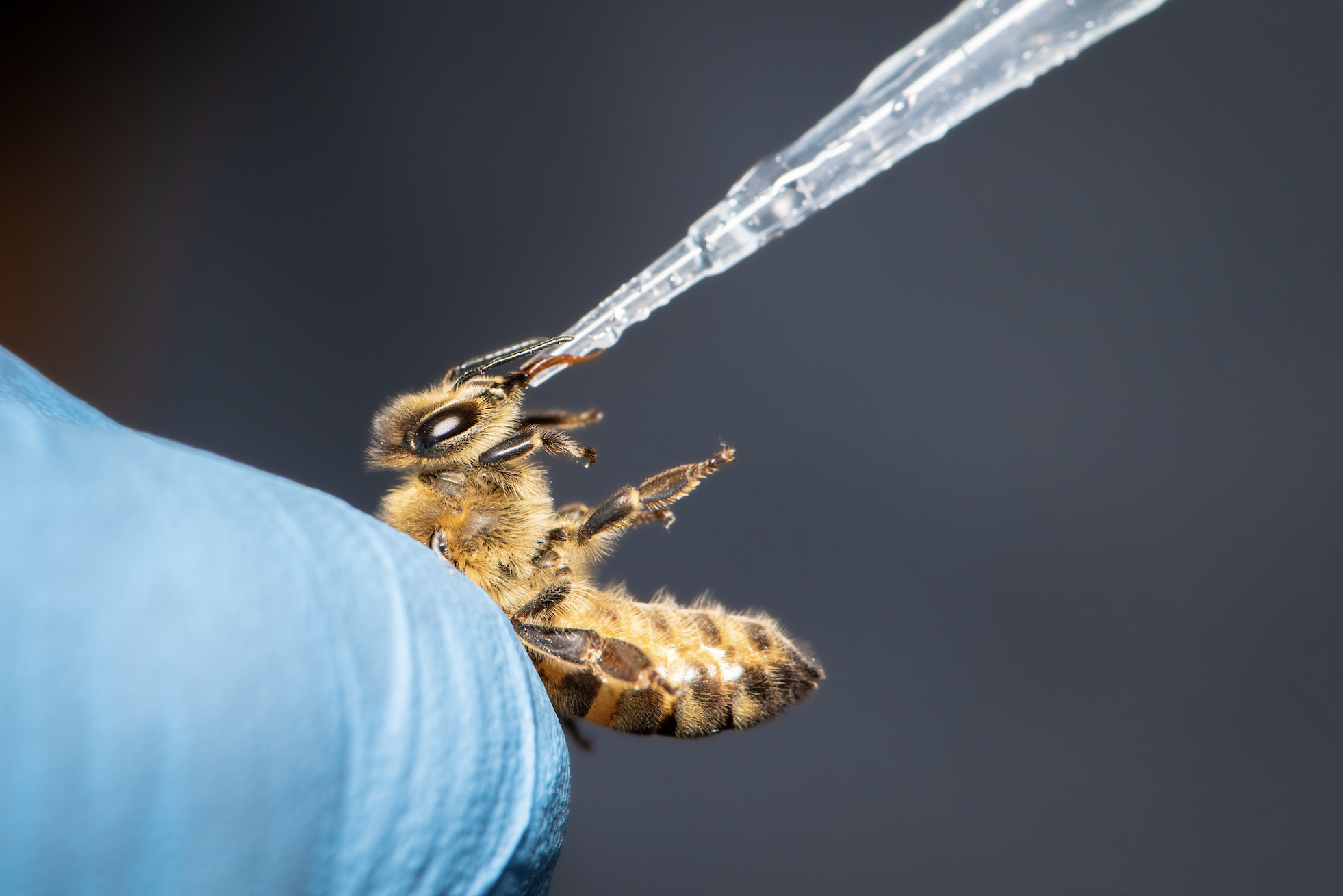 Bottle-feeding a baby bee, aka inoculating a newly emerged bee, is the most critical method of honey bee’s immunity study against nosema, a microsporidian parasite in the midgut. The newly emerged bee will be bottle-fed with mixed sugar syrup and nosema spores to make sure nosema spores will infect them at the same level. This experiment was conducted with more than 4,760 bees in the summer of 2022. We fed any single of them one at a time with the help of the research team at the Honey Bee Research Centre.