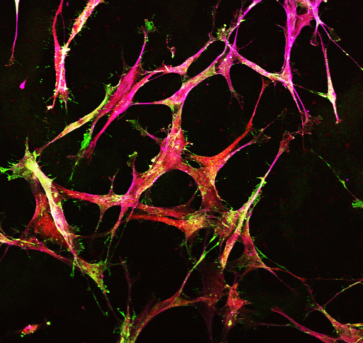The environment effects how and why cancer cells spread to different organs. My research is interested in studying which proteins become activated when the environment changes. These are bone cancer cells grown in a stiff environment and labelled with different fluorescent probes for different proteins. Cells can change their shape and activate certain proteins depending on what kind of environment they are in. In a stiff environment, like the one shown here, cells are stretched and elongated.