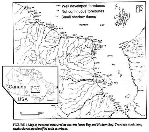absence of dunes in southern James Bay, to some partially deflated foredunes on