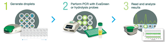 Droplet digital PCR provides absolute quantification of target DNA or RNA molecules without the use of standard curves and can be run with EvaGreen or hydrolysis probe-based chemistries.