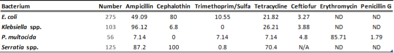 When extrapolating from data such as the ones shown below, one should exercise caution. It should be kept in mind that laboratory data in general are biased, being mostly associated with clinical cases and likely previous treatments. For that reason, the level of resistance in our data may be higher than in the average population. In addition, from the clinical perspective, our data are based on in vitro results. These results may or may not be reproduced in vivo. For example, both S. aureus and Serratia spp. can frequently be sensitive to some or all antimicrobials in vitro but will not respond to the treatment in vivo, particularly not in mastitis cases.