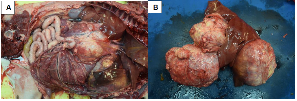 At postmortem, there was compression of all abdominal organs by three large fluid-filled cysts (Fig. 1A). All cysts had a mottled white and red, nodular, heavily vascularized fibrous capsule. The cyst walls were thick and spongy with numerous fluid-filled pockets, and multiple foci of necrosis. The largest cyst measured 22.0 cm x 17.0 cm x 18.0 cm, and two of the three cysts nearly replaced the left medial and caudate process of the caudate lobes of the liver (Fig. 1B). The third cyst was located within the mesentery of the abdomen. There were many abdominal adhesions and generalized enlargement of all abdominal lymph nodes.