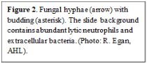 The cytological preparations contained hemorrhagic backgrounds with large numbers of markedly lytic neutrophils. Numerous extracellular bacteria composed of both small cocci and variably sized rod-shaped organisms were noted. Large numbers of extracellular, small, round, slightly refractive structures consistent with conidia were found throughout the slides as well as in clusters in association with stalks, or condiophores (Fig. 1). Also present were numerous septate, non-pigmented fungal hyphae which were intermixed with inflammatory cells (Fig. 2).