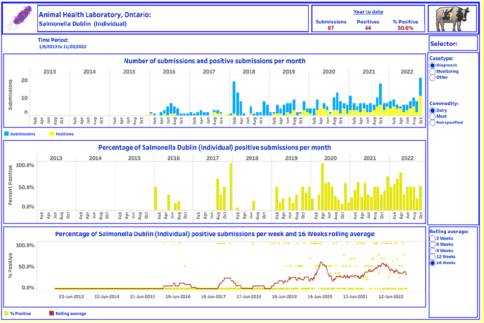 Figure. 2. Salmonella Dublin dashboard illustrating number of individual cow serum and milk ELISA tests, percentage positive and rolling average.