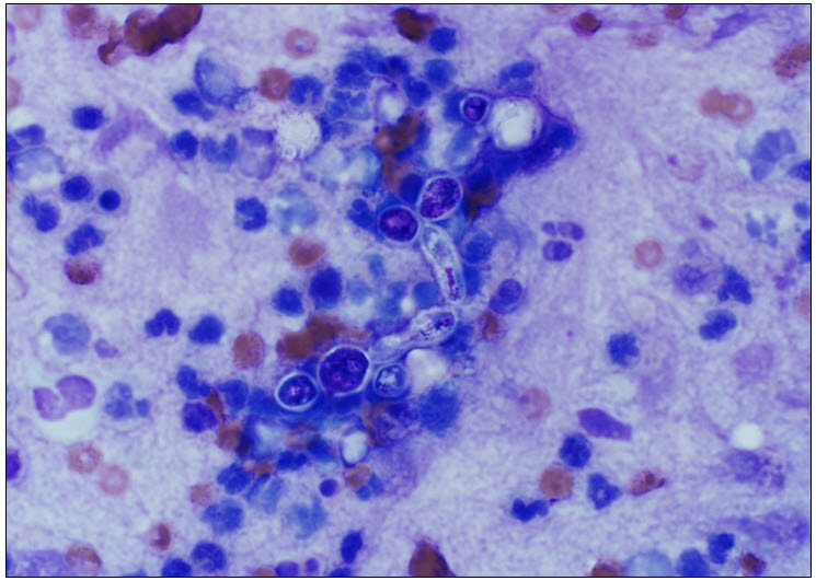 Figure 1. Synovial fluid with yeast and pseudohyphae against an inflammatory cell background. Wright’s stain.
