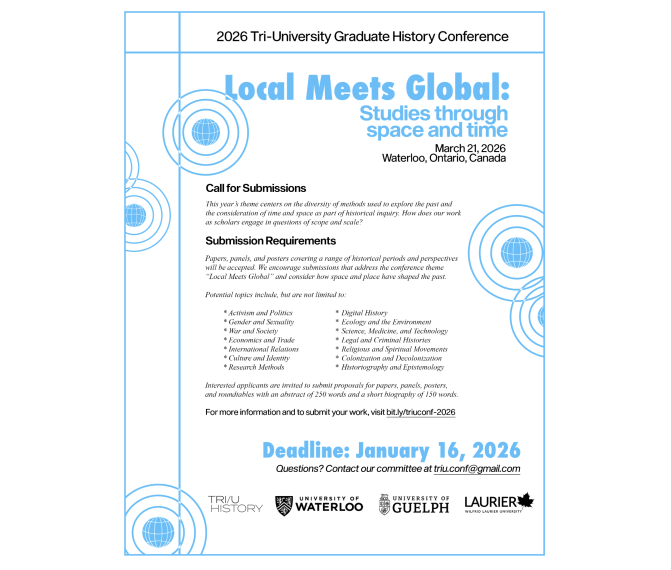The organizing committee for the 2026 Tri-University History conference invites your submissions to present at this year's conference, Saturday, March 21, 2026, at the Balsillie School of International Affairs. Submission deadline is THIS FRIDAY January 16, 2026.