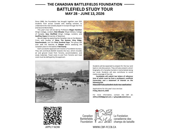 Since 1996, the Canadian Battlefields Foundation has brought together over 300 students from across Canada with leading scholars to understand the role Canada played in Europe through the First and Second World Wars. This year’s tour will be held from 28 May to 13 June 2026 and will explore the Canadian roles on the Western Front, as well as Dieppe and Normandy. On site tours will be led by Professors Megan Hamilton (King’s College, London), Nicholas Wheeler (Royal Military College of Canada), Gary Sheffield (King’s College, London), and Geoffrey Hayes (University of Waterloo).