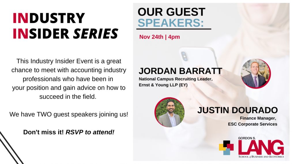 Jordan Barratt, National Campus Recruiting Leader at Ernst & Young LLP (EY) will provide advice about navigating the recruitment process. Alumnus Justin Dourado, Finance Manager at ESC Corporate Services, will talk about his journey as a recent graduate, obtaining his CPA and getting started in the field.