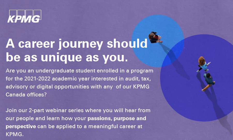 "At KPMG in Canada, we believe that a career journey should be as unique as you. That’s why we’re hosting a 2-part webinar series where you will hear from our people and learn how your passions, purpose and perspective can be applied to a meaningful career at KPMG. We will also be sharing recruitment tips at the end of each webinar!