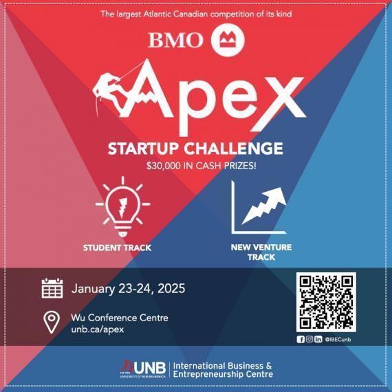 The University of New Brunswick is excited to host the 15th annual BMO Apex Startup Challenge on January 23 and 24, 2025 in Fredericton, NB. With over $30,000 in cash prizes, networking activities and mentorship from experienced business leaders, you will have the opportunity to compete, learn, and have fun with the future entrepreneurs from across Canada! If you are entrepreneurially driven, this is your chance to take your ideas to the next level!