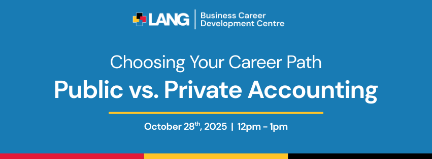 Join the Business Career Development Centre to explore the key differences between Public Accounting and Private Accounting. Learn how public accountants serve a variety of clients across industries, while private accountants work in-house to support the financial health of one organization. Hear from alumni who will share insights on day-to-day responsibilities, career growth, and how to decide which path is right for you. Register below!
