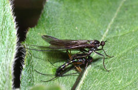 “Empidids” can generally be differentiated from the similar Dolichopodidae s. str. by their lack of green metallic body coloration. However, some “Empididae” (e.g. most Lamprempis Wheeler and Melander) are metallic green and some dolichopodids are not metallic. However, all Dolichopodidae have the Rs vein originating at or near the level of crossvein h and have crossvein r-m situated in the basal fourth of the wing unlike “empidids” (except the microphorid genera), which have the Rs vein originating well distal to the level of crossvein h and have crossvein r-m distal to the basal fourth of the wing. In addition, male dolichopodids have their terminalia rotated forward beneath the preceding segments of the abdomen, unlike empidids (except the microphorid genera). The microphorid group of genera (sensu Chvála 1983) are similar to dolichopodids, but they are never metallic green and have cell dm closed by a complete or nearly complete bm-cu crossvein, rather than having cells dm and bm confluent. Some bombyliid and asiloid groups (e.g. therevids s.l.) can be confused with “empidids”, but these flies generally have a larger anal cell (cup) that attains, or nearly attains, the wing margin and they lack predacious modifications in either the legs or the mouthparts. A few platypezids (e.g. Microsania Zetterstedt) can also be confused with empidids, but the arista of these small flies is three-segmented rather than two-segmented (as in the stylus of most “empidids”), and the acrostichal setae are uniserial, rather than biserial or absent. Immature stages are known for only a few species of “Empididae” (see Steyskal and Knutson 1981; Cumming and Cooper 1993) and these are very similar in general to the immature stages of Dolichopodidae s.str. Natural historyThe species classified in the “Empididae” represent a large group of predaceous flies, including a few flower-visiting taxa. Adults are often found in various forest habitats, on leaves, tree trunks, aquatic vegetation, or in stream beds and seepage habitats, although some taxa are associated with more open areas such as agricultural fields, grasslands, marshes, coastal zones and beaches (Collin 1961; Cumming and Cooper 1992). Adults capture various arthropod prey, including small to medium sized Diptera, Homoptera, Hemiptera, Thysanoptera, Lepidoptera, Trichoptera, Hymenoptera, Neuroptera, Ephemeroptera, Plecoptera, Coleoptera, Collembola, and Acari (Tuomikoski 1952; Smith 1969; Cumming and Cooper 1993). Predaceous “empidid” flies are important natural and biological control agents of various pest insect species because of the wide range of habitats occupied and their vast species diversity. A number of adult “Empididae” also visit flowers presumably to obtain nectar, but at least a few groups (e.g. Iteaphila Zetterstedt, Anthepiscopus Becker, Anthalia Zetterstedt, Allanthalia Melander and Euthyneura Macquart) obtain all their protein requirements by feeding on pollen (Downes and Smith 1969; Grimaldi 1999). Larvae are generally found in moist soil, rotten wood, dung, or in aquatic habitats and also appear to be predaceous on various arthropods, particularly other Diptera larvae (Cumming and Cooper 1993).