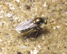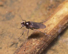Adults are predaceous, feeding primarily on small, soft-bodied arthropods and annelids, and are important natural enemies of pests in a variety of habitats including agroecosystems. Ulrich (2005) provided an exhaustive review of literature data on predation by adult Dolichopodidae and found that the larvae and adults of Diptera are the most frequently observed prey (especially Chironomidae and Culicidae, but see comments by Ulrich 2005), followed by Homoptera, Collembola, mites and Thysanoptera. Other documented prey items include annelids, cladocerans, amphipods, small myriapods, odonate eggs, termites, psocopterans, beetle larvae (i.e. Scolytidae and Curculionidae), early instar caterpillars, dead and wounded arthropods and amphibian embryos (see references in Ulrich 2005). Although the adults of some dolichopodids (e.g., Hydrophorus Fallén, Scellus Loew, Hydatostega Phillipi, Thinophilus Wahlberg, Aphrosylus Haliday) are known to use their forelegs to hold and manipulate their prey (Roubaud 1903; Doane 1907; Williams 1939; Harmston 1948; Peterson 1960), most grab and masticate prey with their epipharynx and labellum, suck up the liquids and discard the remains (see references in Ulrich 2005). In addition to feeding on live prey, many dolichopodids have also been observed taking up honeydew, and it is thought that most species do so in order to obtain carbohydrates (Ulrich 2005). Adults of some Dolichopodinae have elongate mouthparts (e.g., Ortochile Latreille, some species of Hercostomus Loew s.l.) and are known to be anthophilous and feed on nectar (Dyte, unpublished manuscript). The morphology of the mouthparts of adult dolichopodids has been studied by Cregan (1941) and Satô (1991)