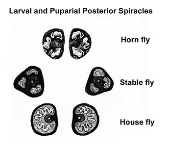 Each spiracle is dark with 3 S-shaped slits surrounding a central button