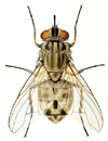 housefly. They are gray in colour with 4 dark stripes on the thorax