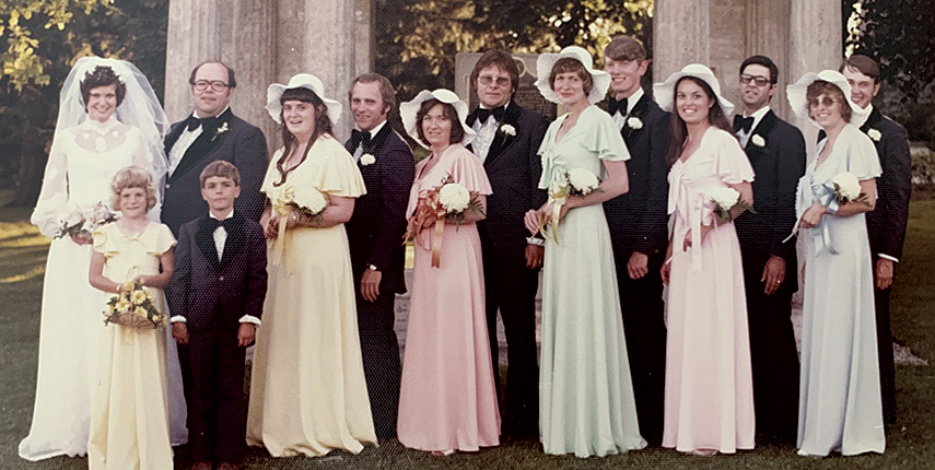 Caring for injured Gryphon athletes on campus brought Helen Clark and Fred Dunbar together in the early 1970s. A nurse, Helen worked in the student health centre. Fred joined the University in 1969 as the Gryphons athletic trainer. Helen and Fred were married June 21, 1975. Pictured here with their wedding party before the Portico on Johnston Green, the couple are believed to have been the first to hold their wedding reception at the Arboretum Centre, opened in 1974. In 1976, Fred became head of the Toronto Argonauts training staff. He was integral in bringing the CFL team to U of G for its training camps, still ongoing. He died Nov. 18, 2021. On June 12, 2022, an athletic therapy room in the Gryphons football pavilion was named to honour his legacy. Fred was inducted into the Gryphon Hall of Fame as a builder in 1987.