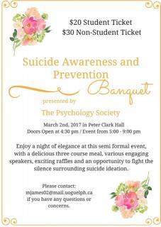 The Undergraduate Psychology Society is hosting a Suicide Awareness and Prevention Banquet. This semi-formal event will consist of a 3 course meal, raffles, and engaging speakers promoting awareness and discussion about suicide ideation on and off campus.