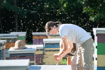 A woman kneeling down with bees flying all around her