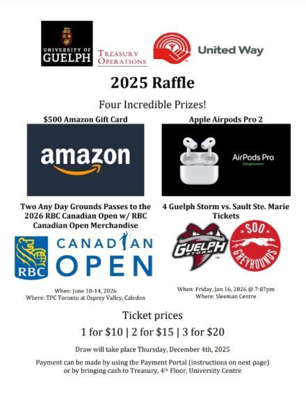 Win big while giving back! Treasury Operations is supporting the University of Guelph’s 2025 United Way Campaign with a raffle featuring four amazing prizes: