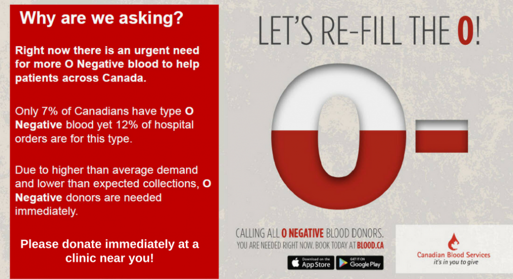 Approximately every minute of every day, someone in Canada needs blood. In fact, per a recent poll, 52 per cent of Canadians say they, or a family member, have needed blood or blood products for surgery or for medical treatment.